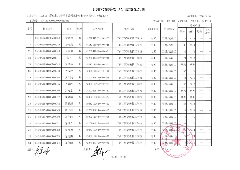 广西工贸高级技工学校关于2026-04-16第64批职业技能等级认定成绩公示