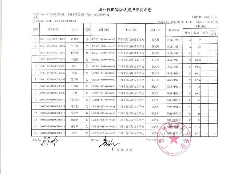 广西工贸高级技工学校关于2026-04-20第80批职业技能等级认定成绩公示