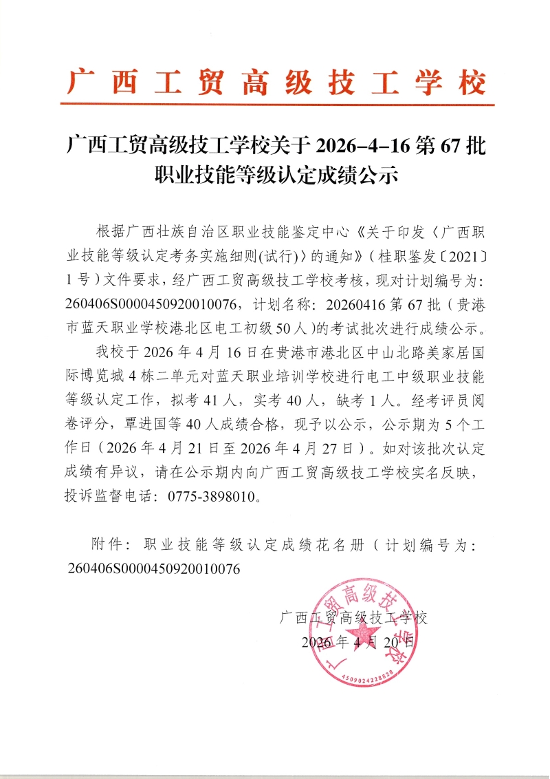 广西工贸高级技工学校关于2026-4-16第67批职业技能等级认定成绩公示