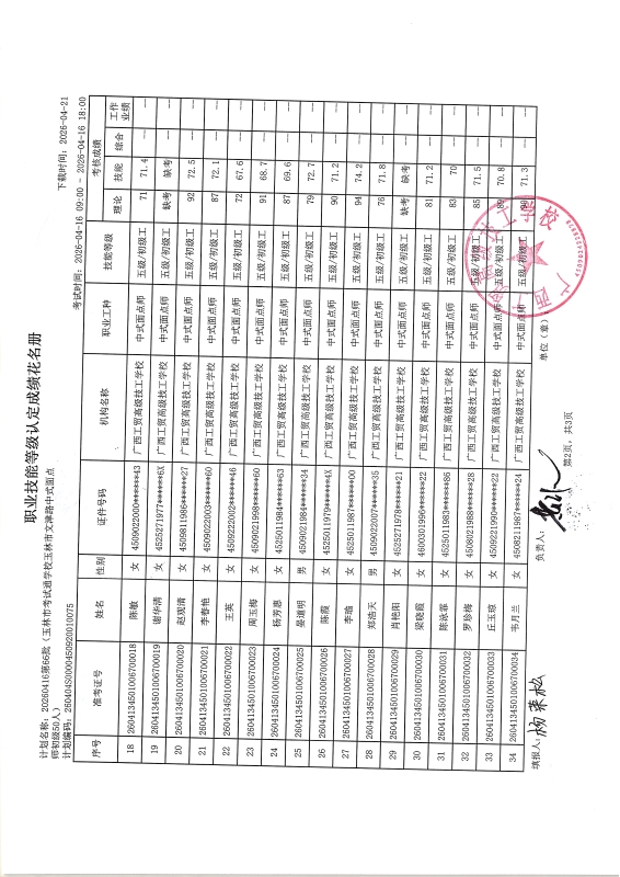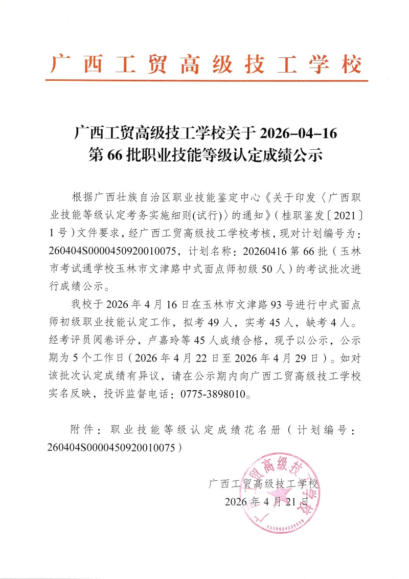 广西工贸高级技工学校关于2026-04-16第66批职业技能等级认定成绩公示