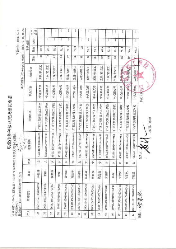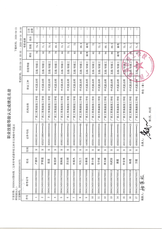 广西工贸高级技工学校关于2026-04-15第63批职业技能等级认定成绩公示