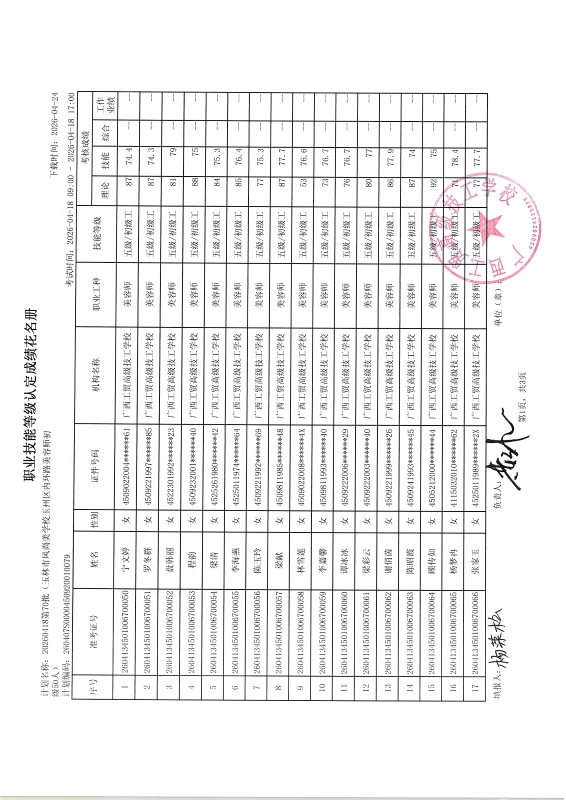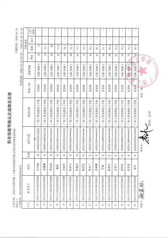 广西工贸高级技工学校关于2026-04-21第74批职业技能等级认定成绩公示