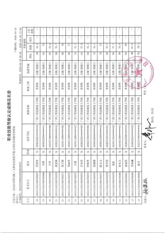 广西工贸高级技工学校关于2026-04-18第70批职业技能等级认定成绩公示