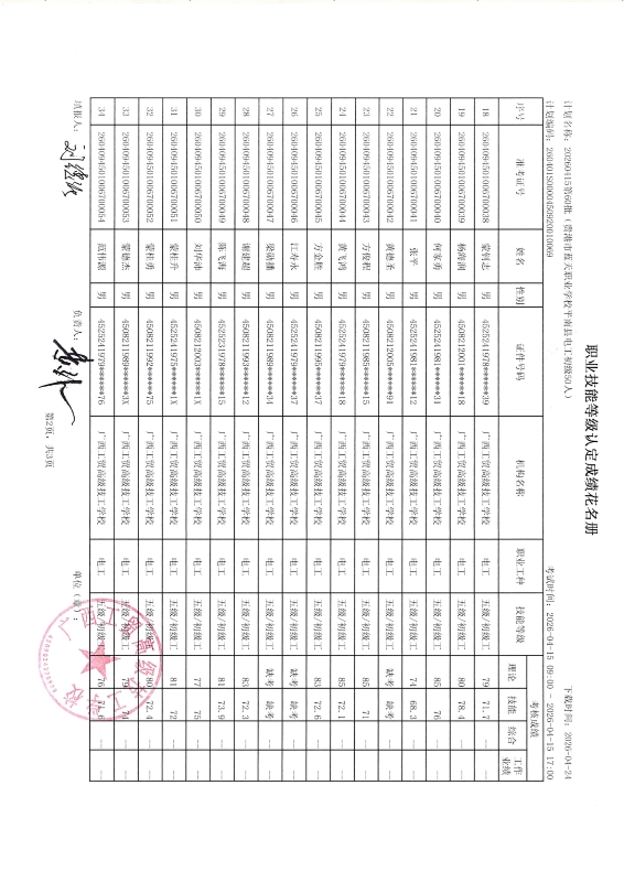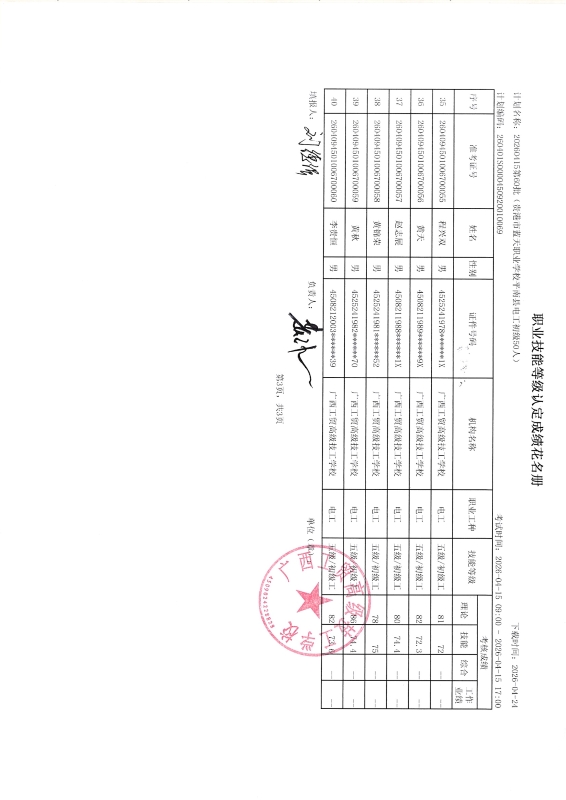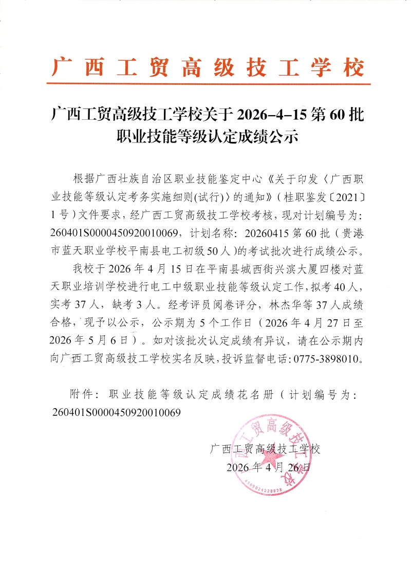 广西工贸高级技工学校关于2026-4-15第60批职业技能等级认定成绩公示