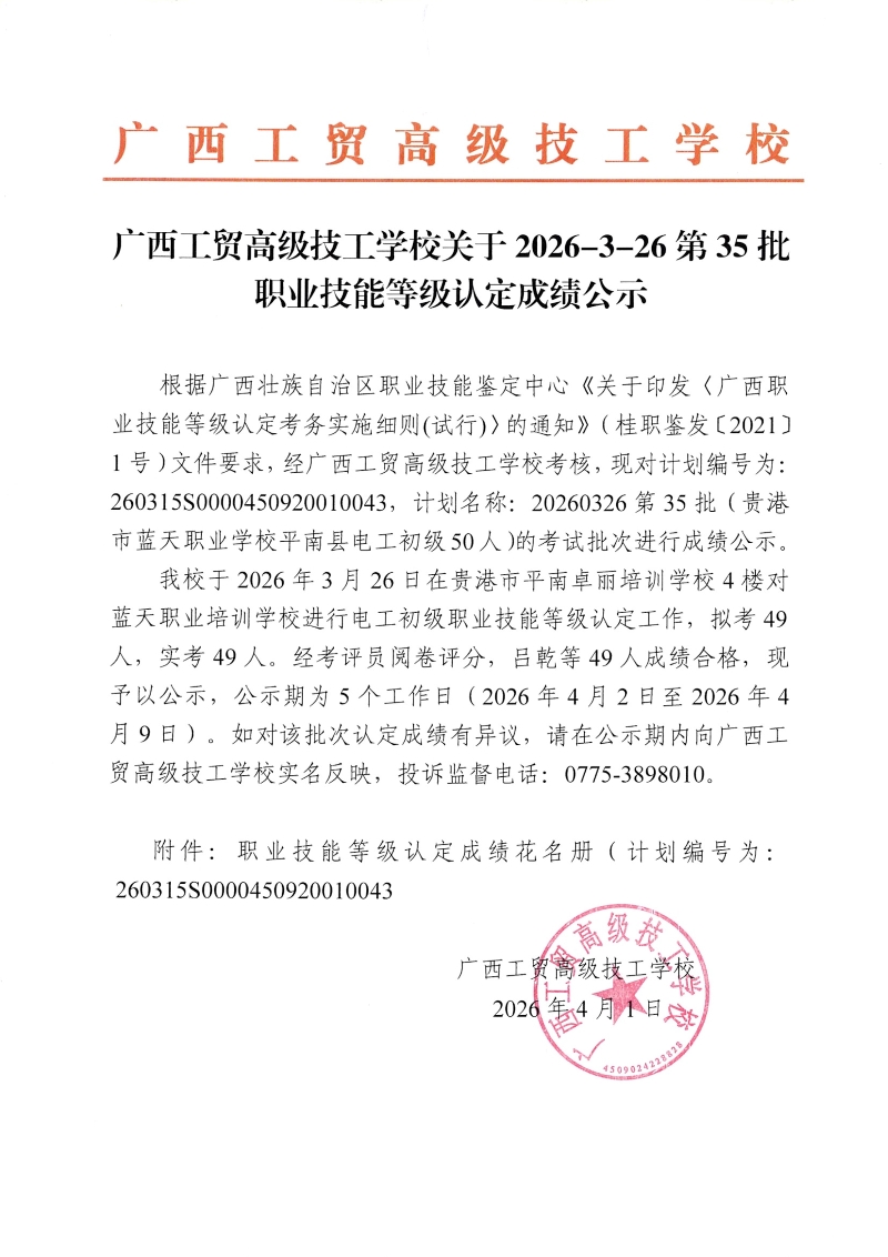 广西工贸高级技工学校关于2026-3-26第35批职业技能等级认定成绩公示