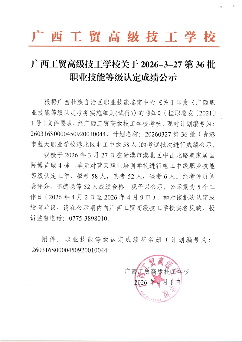 广西工贸高级技工学校关于2026-3-27第36批职业技能等级认定成绩公示