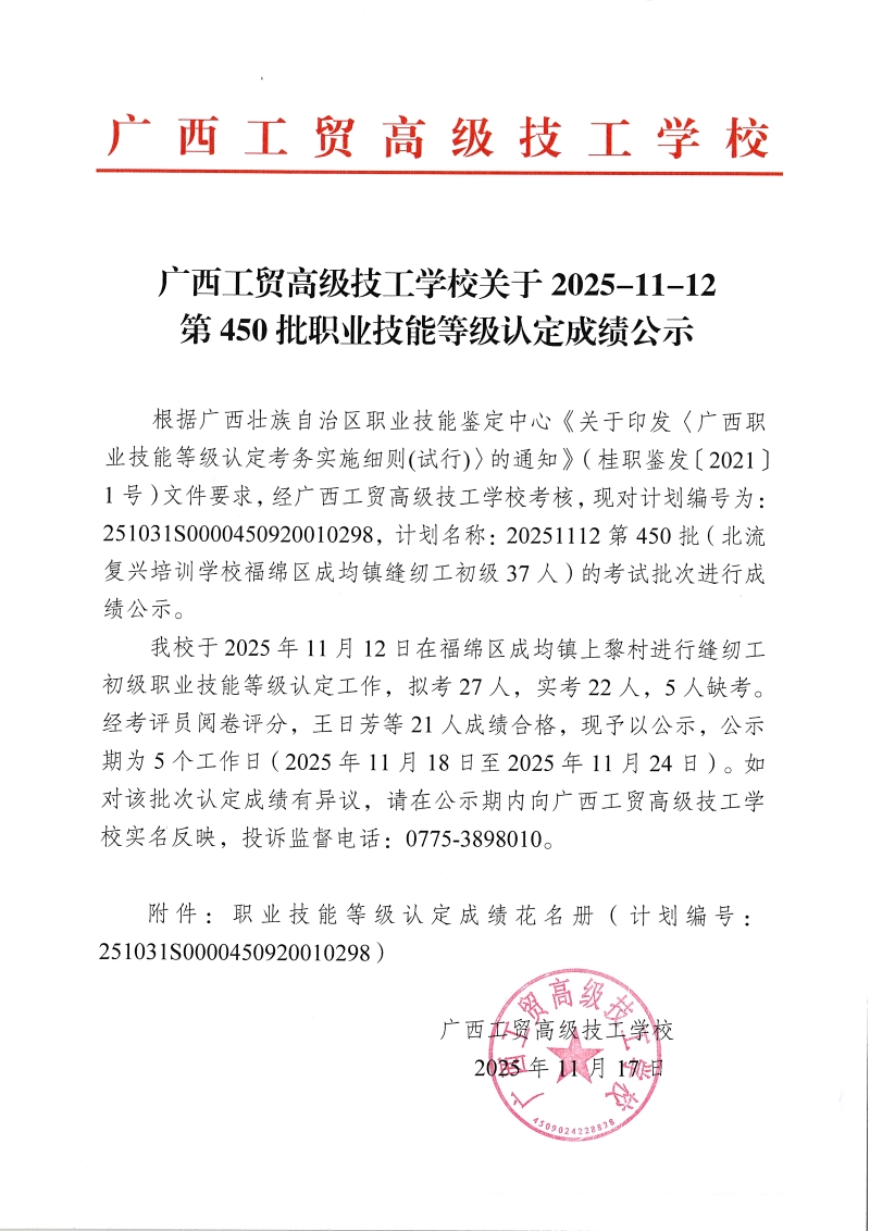 广西工贸高级技工学校关于2025-11-12第450批职业技能等级认定成绩公示