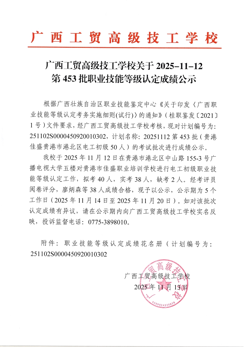 广西工贸高级技工学校关于2025-11-12第453批职业技能等级认定成绩公示