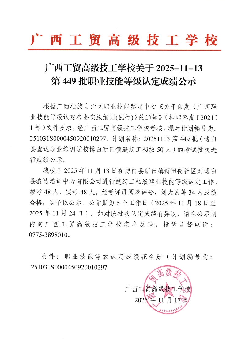 广西工贸高级技工学校关于2025-11-13第449批职业技能等级认定成绩公示
