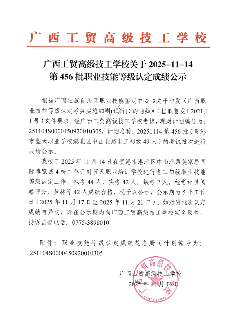 广西工贸高级技工学校关于2025-11-14第456批职业技能等级认定成绩公示