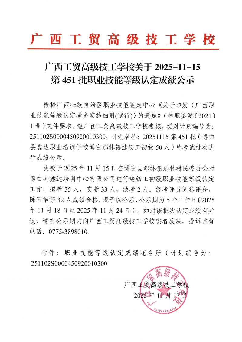 广西工贸高级技工学校关于2025-11-15第451批职业技能等级认定成绩公示