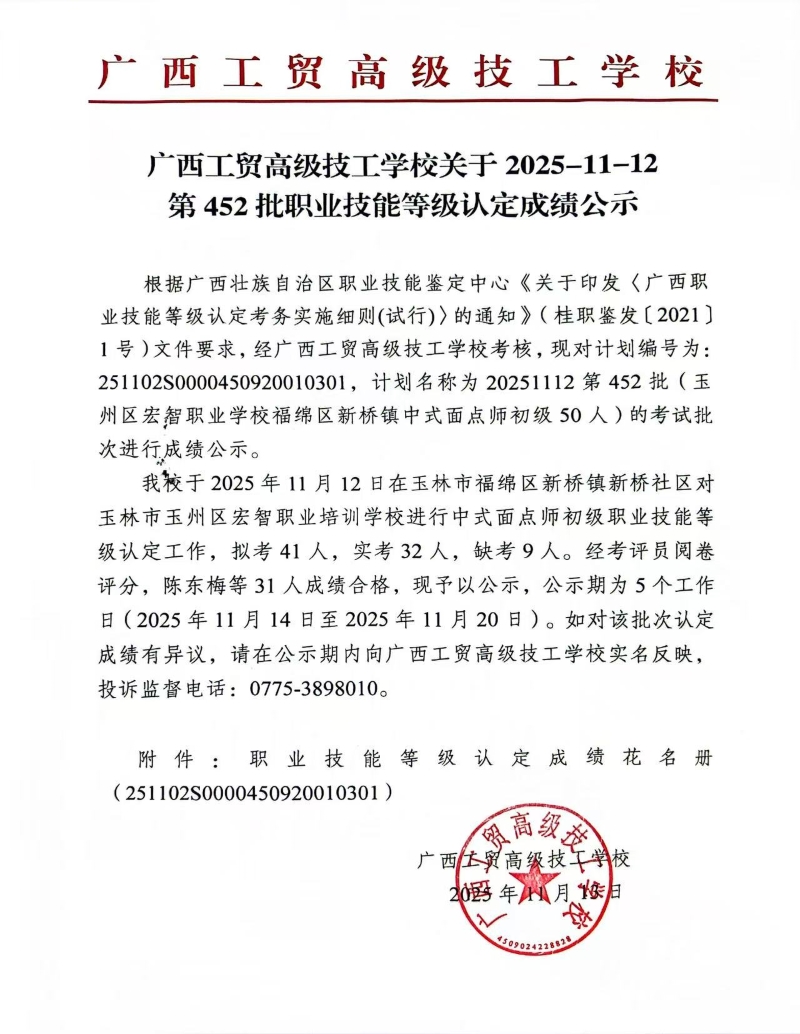 广西工贸高级技工学校关于2025-11-12第452批职业技能等级认定成绩公示