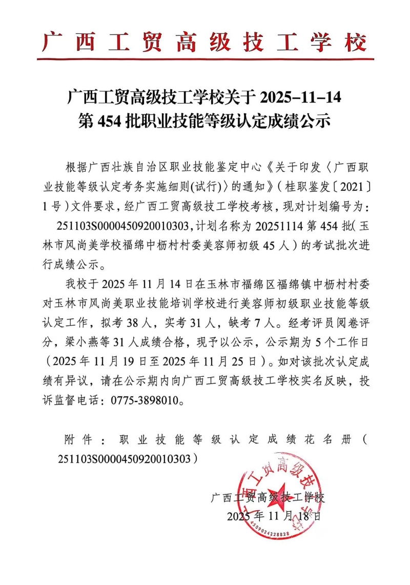 广西工贸高级技工学校关于2025-11-14第454批职业技能等级认定成绩公示