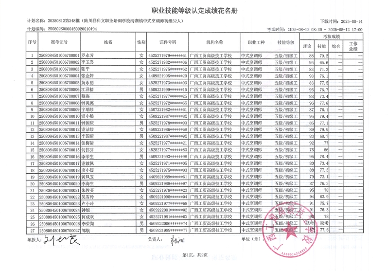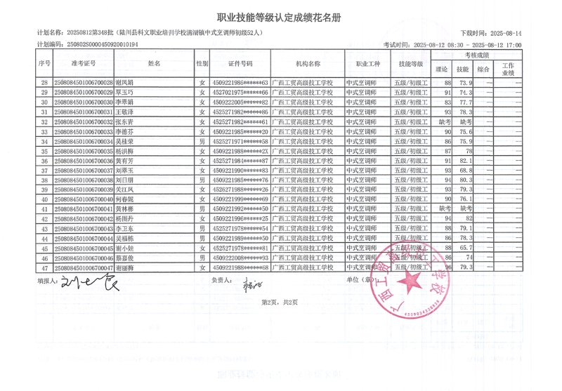 广西工贸高级技工学校关于20250812第348批职业技能等级认定成绩公示