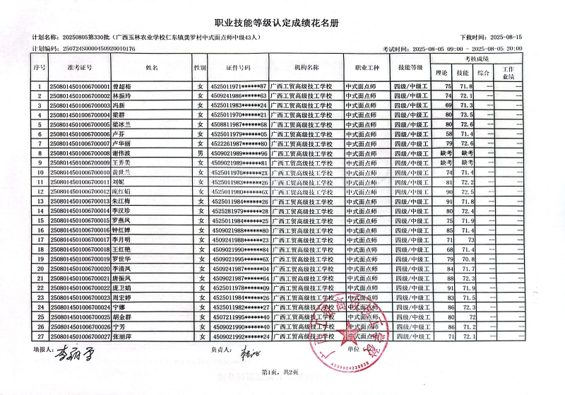 广西工贸高级技工学校关于2025-8-5第330批职业技能等级认定成绩公示