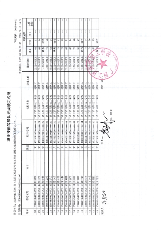广西工贸高级技工学校关于2025-8-13第351批职业技能等级认定成绩公示