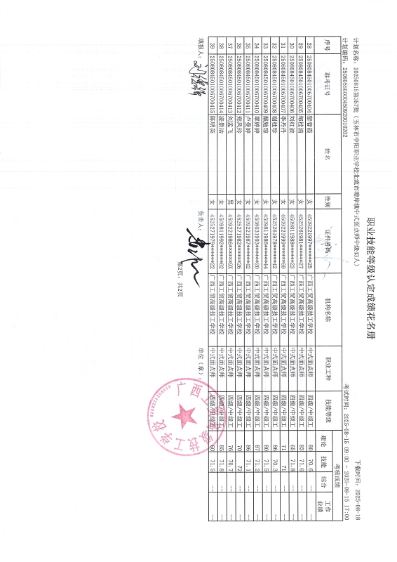 广西工贸高级技工学校关于2025-08-15第357批职业技能等级认定成绩公示