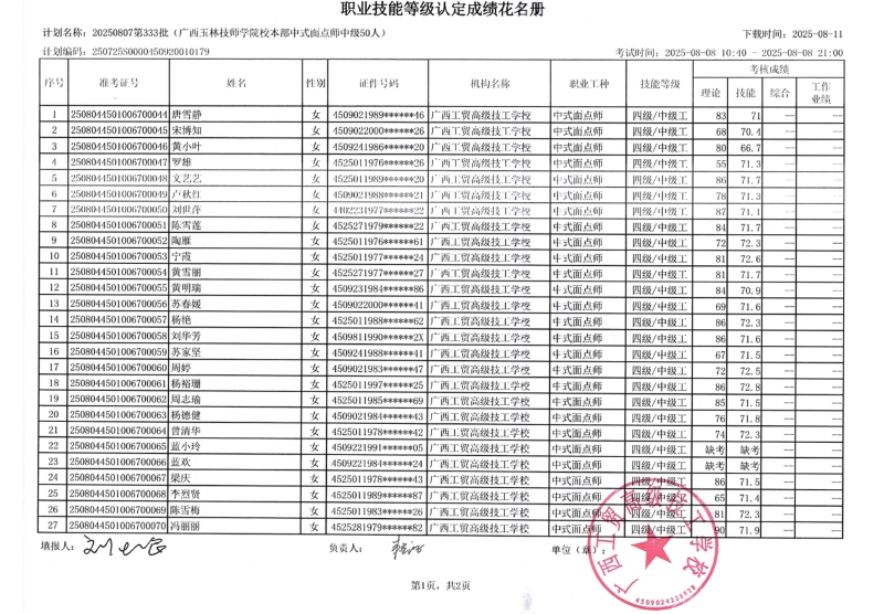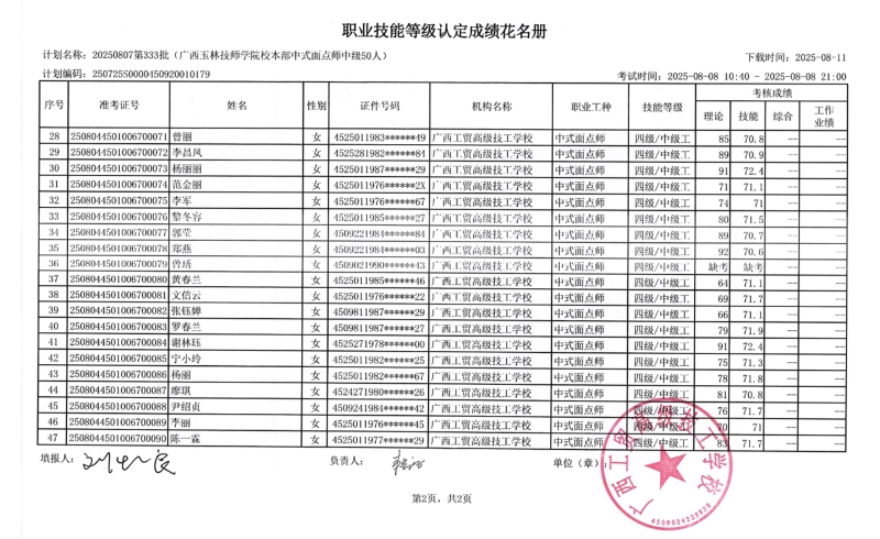 广西工贸高级技工学校关于2025-8-8第333批职业技能等级认定成绩公示