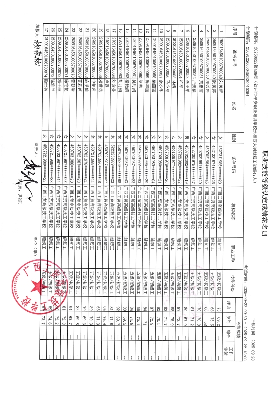广西工贸高级技工学校关于2025-09-22第408批职业技能等级认定成绩公示