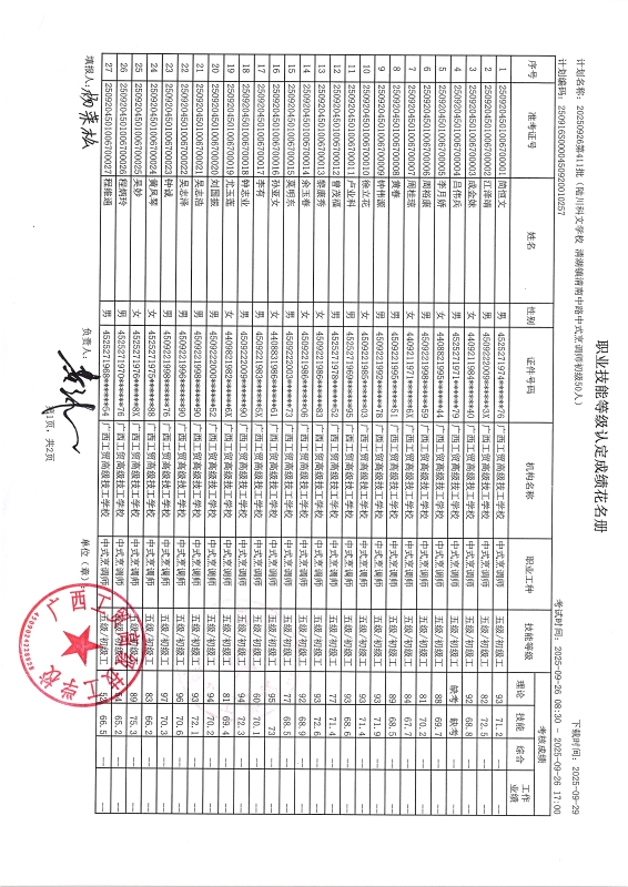 广西工贸高级技工学校关于2025-09-26第411批职业技能等级认定成绩公示