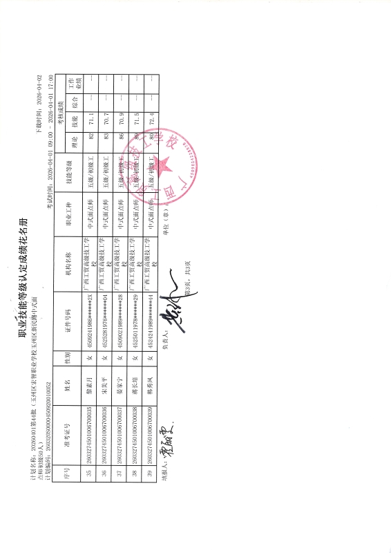 广西工贸高级技工学校关于2026-04-01第44批职业技能等级认定成绩公示