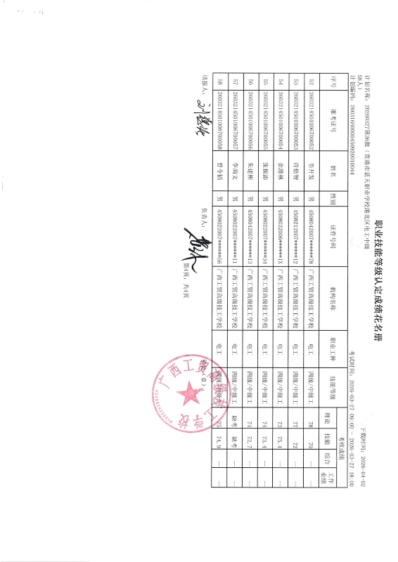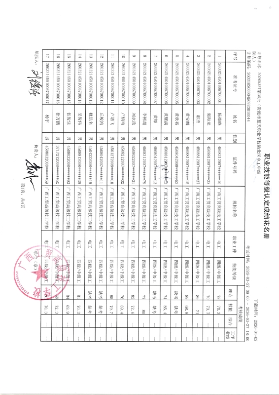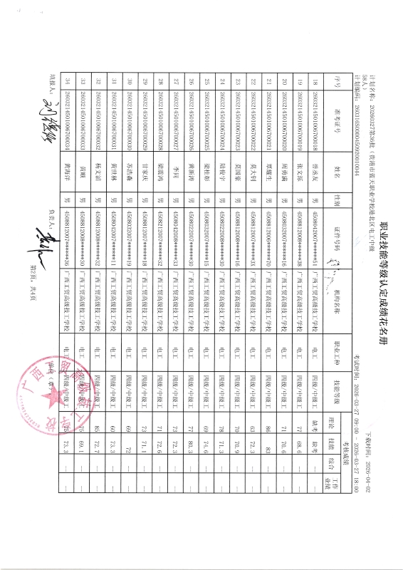 广西工贸高级技工学校关于2026-3-27第36批职业技能等级认定成绩公示