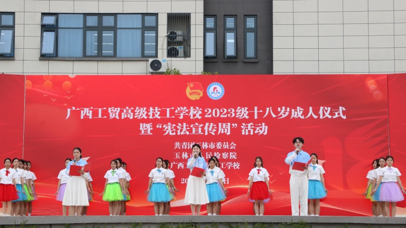 为引导学生树立责任意识、增强法治观念,迈好成年之路上的第一步,12月5日上午,学校在福绵校区运动场举行2023级学生十八岁成人礼仪式暨“宪法宣传周”主题活动。共青团玉林市委员会副书记陈方恒、玉林市人民检察院未成年人检察部主任李佳、校领导及2023级全体师生共同参加。