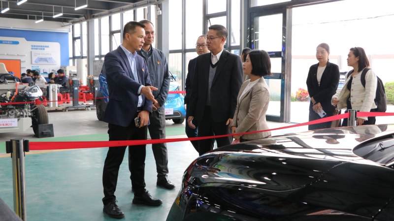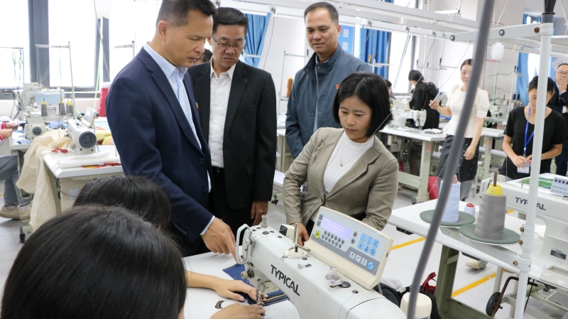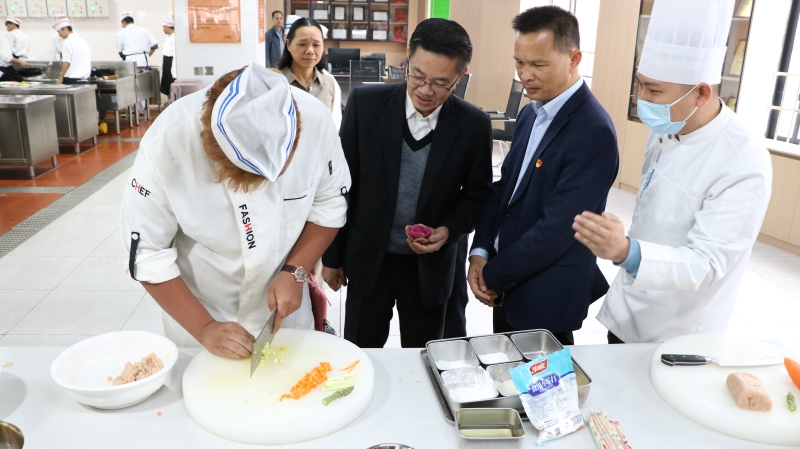 学校领导班子陪同代表团先后参观了玉州、福绵两个校区。在党委书记、校长林德顺同志的介绍下,详细了解烹饪(中式烹调)、新能源汽车检测与维修、服装设计与制作、数控加工及电子商务等重点专业实训课堂的教学模式,实地观摩学生实操过程,并与师生互动交流: