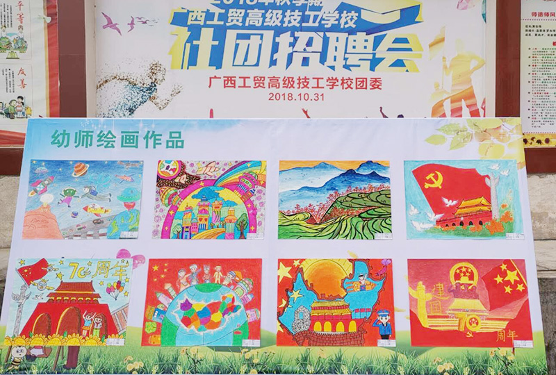 图为活动现场学生用绘画作品献礼祖国七十华诞