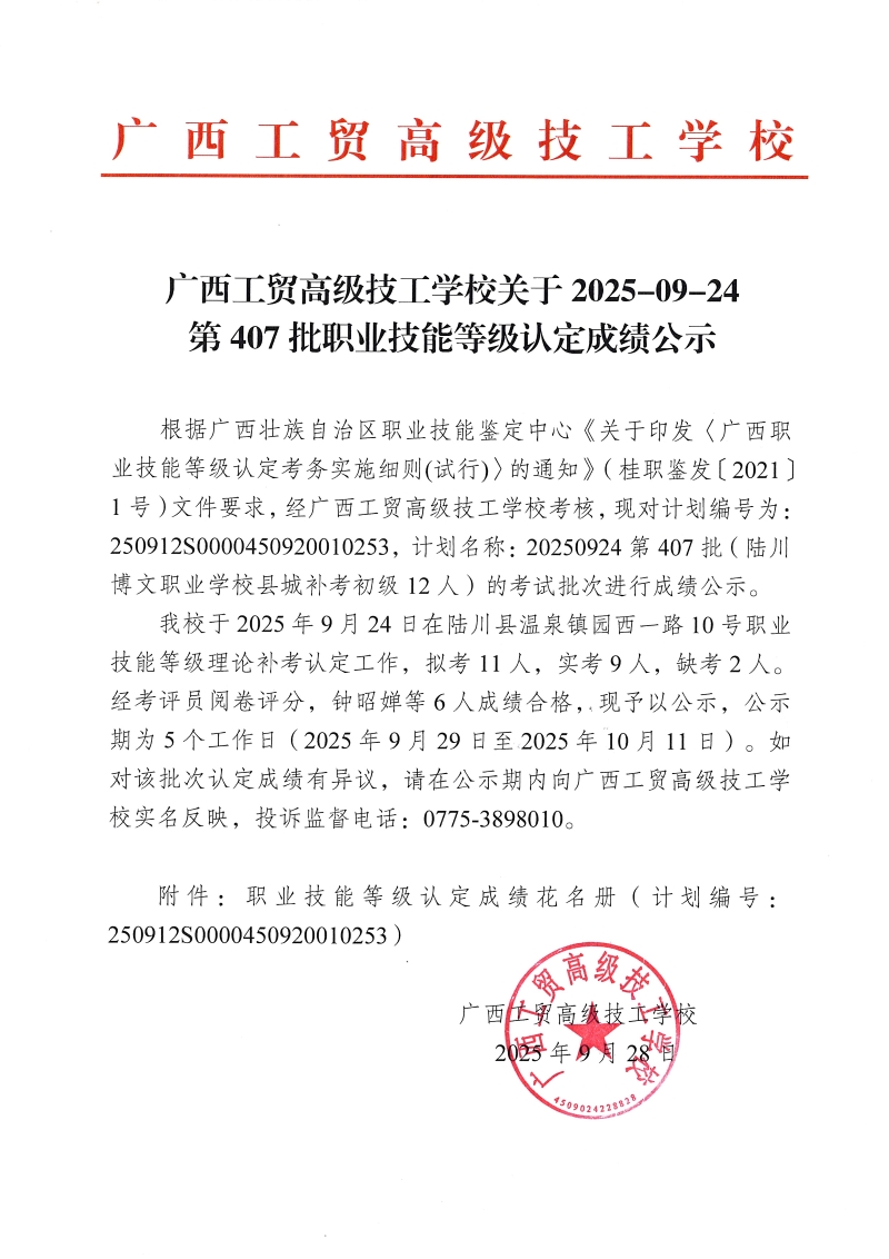 广西工贸高级技工学校关于2025-09-24第407批职业技能等级认定成绩公示