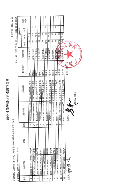 广西工贸高级技工学校关于2025-09-22第408批职业技能等级认定成绩公示