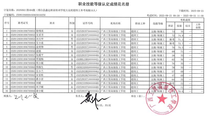 广西工贸高级技工学校关于2025-9-21第404批职业技能等级认定成绩公示