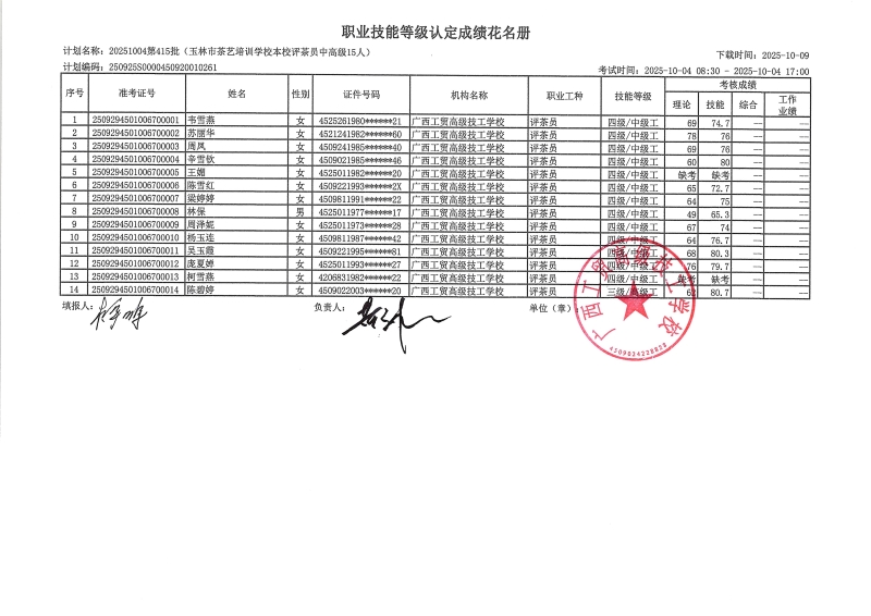 广西工贸高级技工学校关于2025-10-4第415批职业技能等级认定成绩公示
