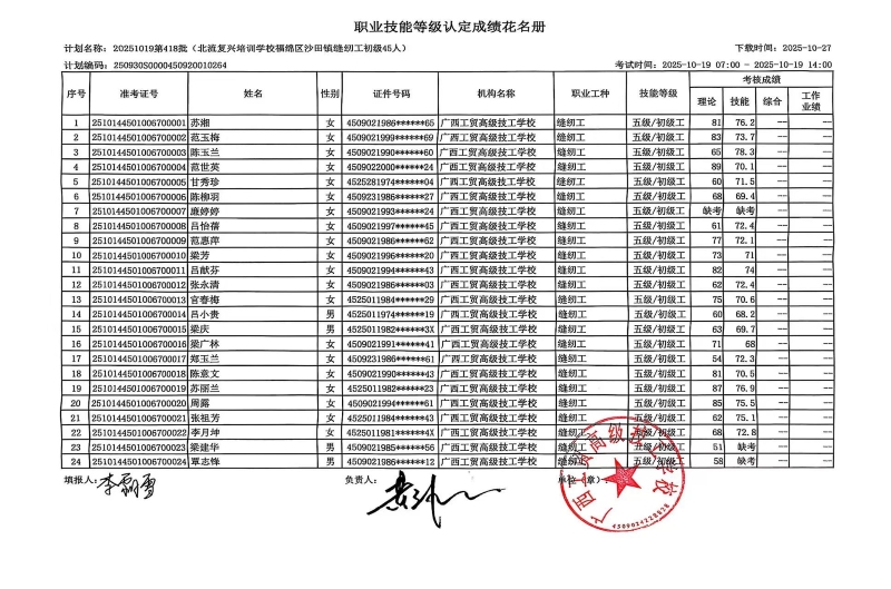 广西工贸高级技工学校关于2025-10-19第418批职业技能等级认定成绩公示