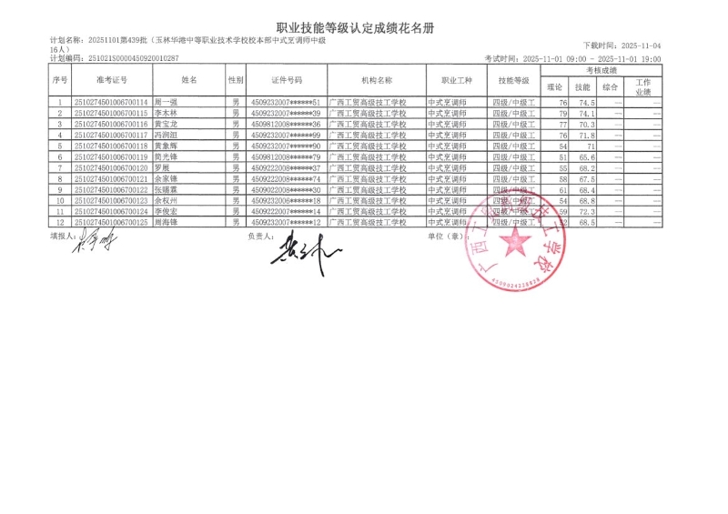 广西工贸高级技工学校关于2025-11-1第439批职业技能等级认定成绩公示