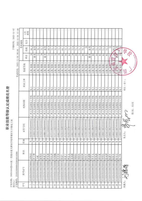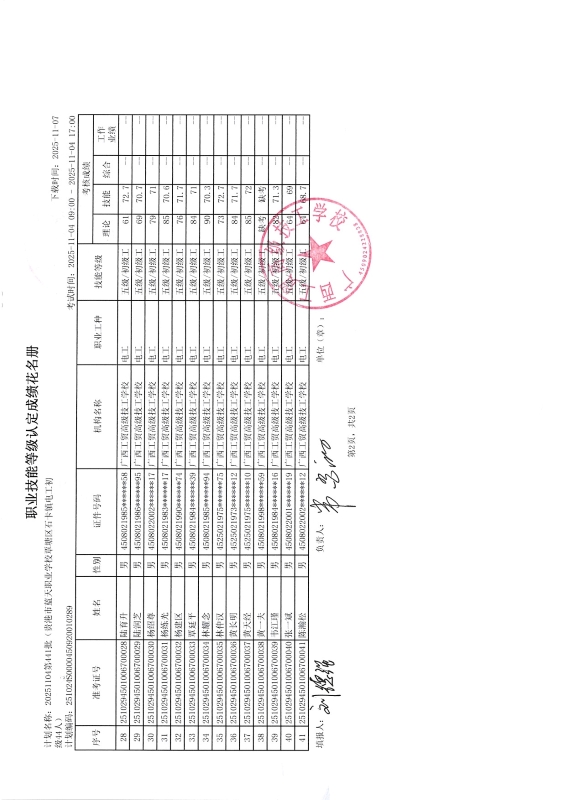 广西工贸高级技工学校关于2025-11-04第441批职业技能等级认定成绩公示