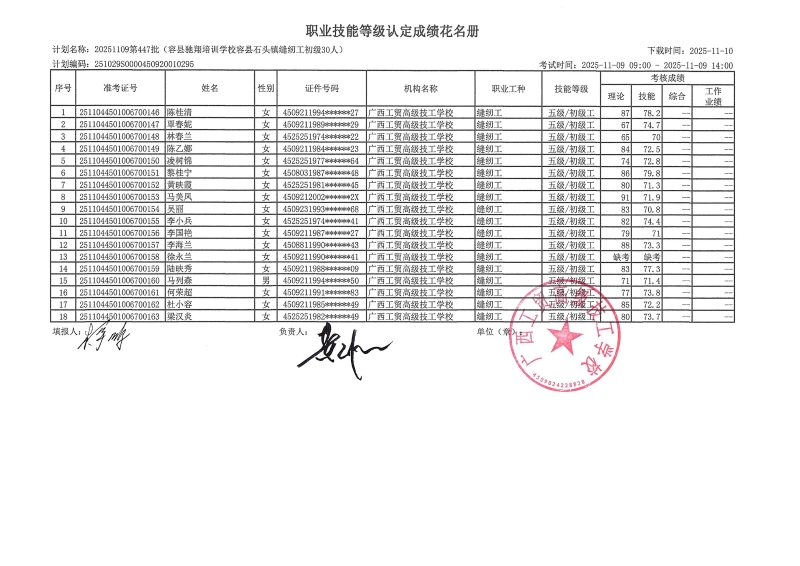 广西工贸高级技工学校关于2025-11-9第447批职业技能等级认定成绩公示