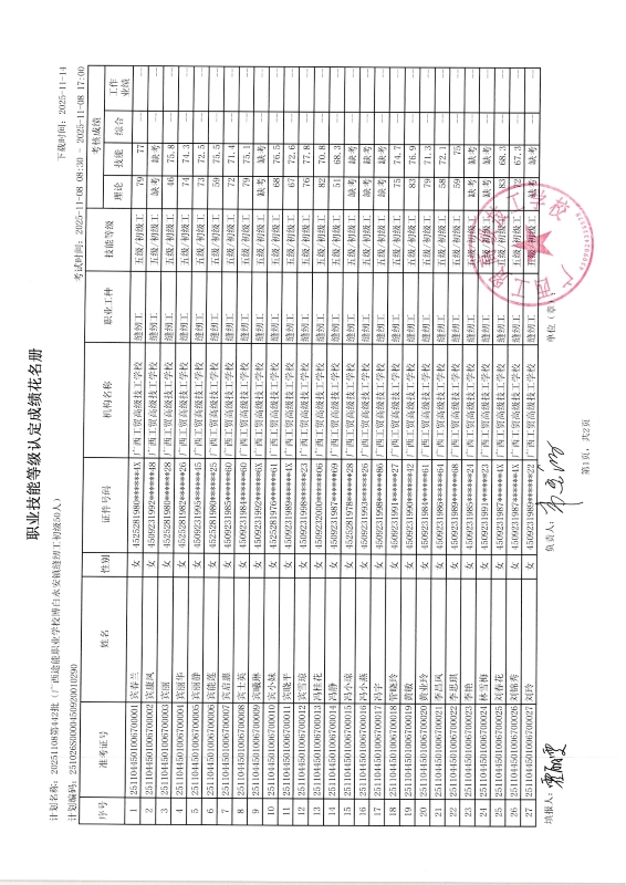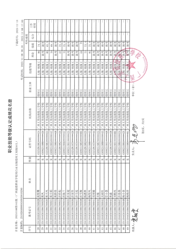 广西工贸高级技工学校关于2025-11-09第444批职业技能等级认定成绩公示