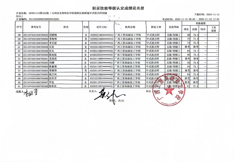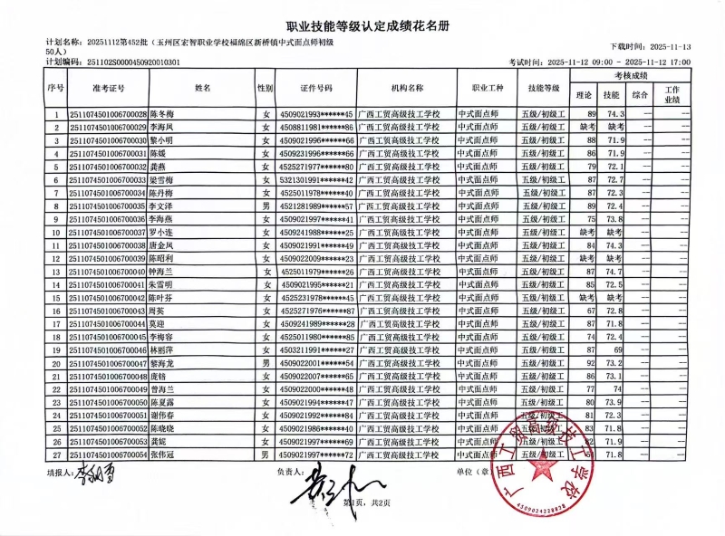 广西工贸高级技工学校关于2025-11-12第452批职业技能等级认定成绩公示