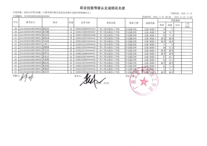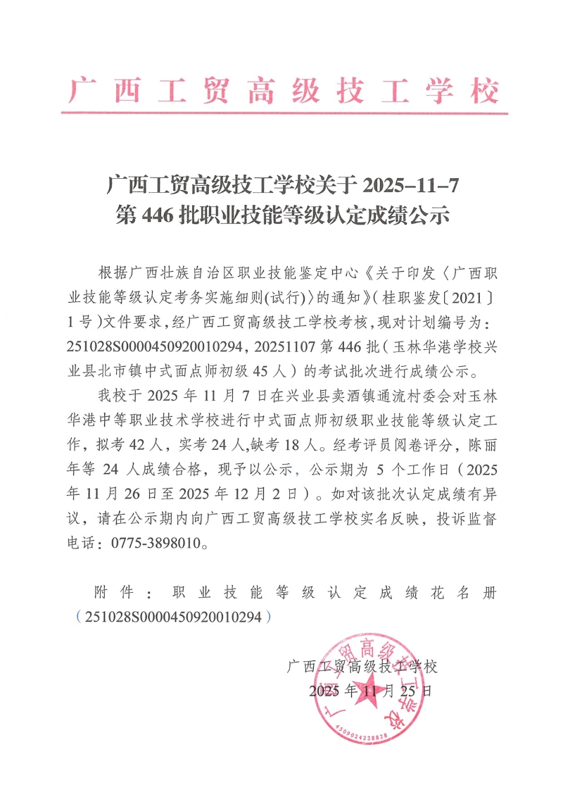 广西工贸高级技工学校关于2025-11-7第446批职业技能等级认定成绩公示