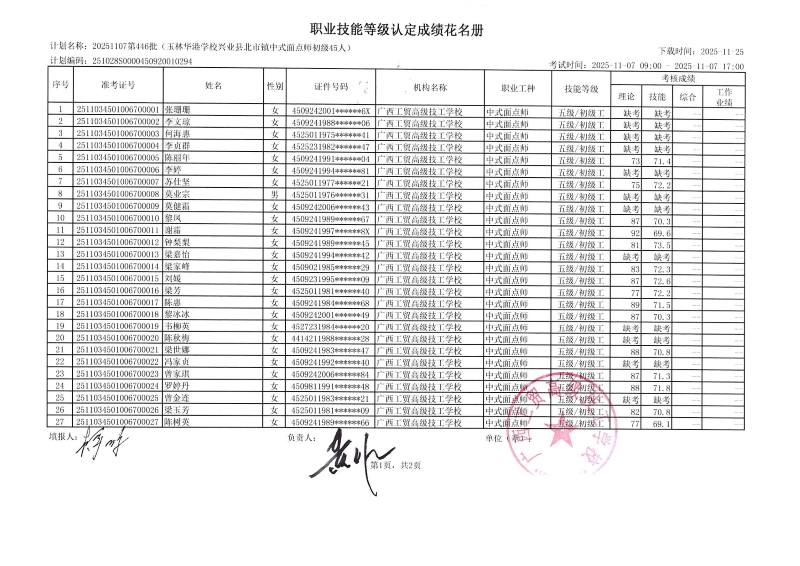 广西工贸高级技工学校关于2025-11-21第27批专项职业能力认定成绩公示