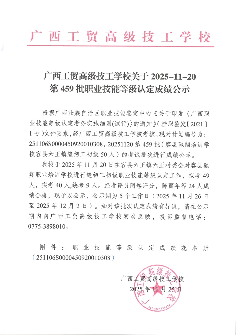 广西工贸高级技工学校关于2025-11-20第459批职业技能等级认定成绩公示