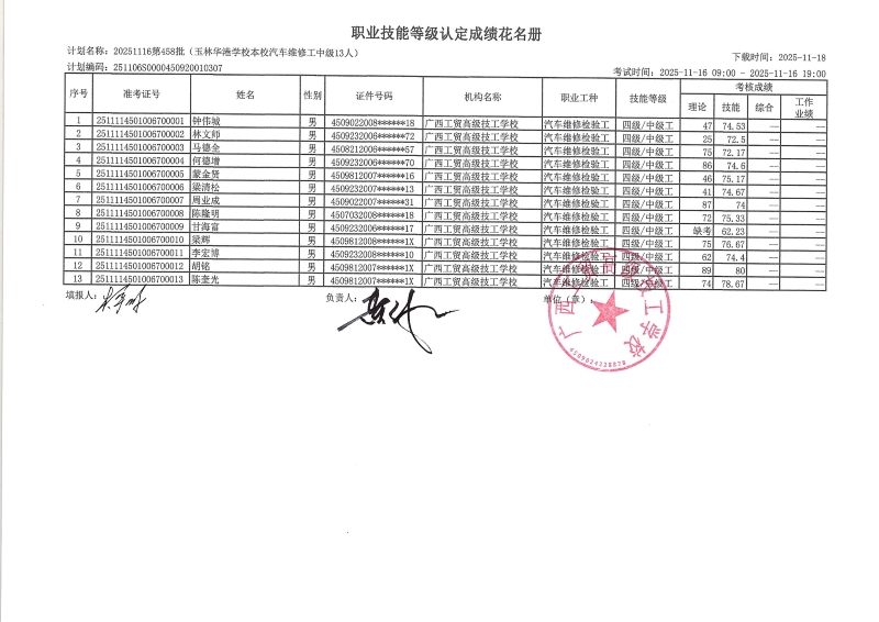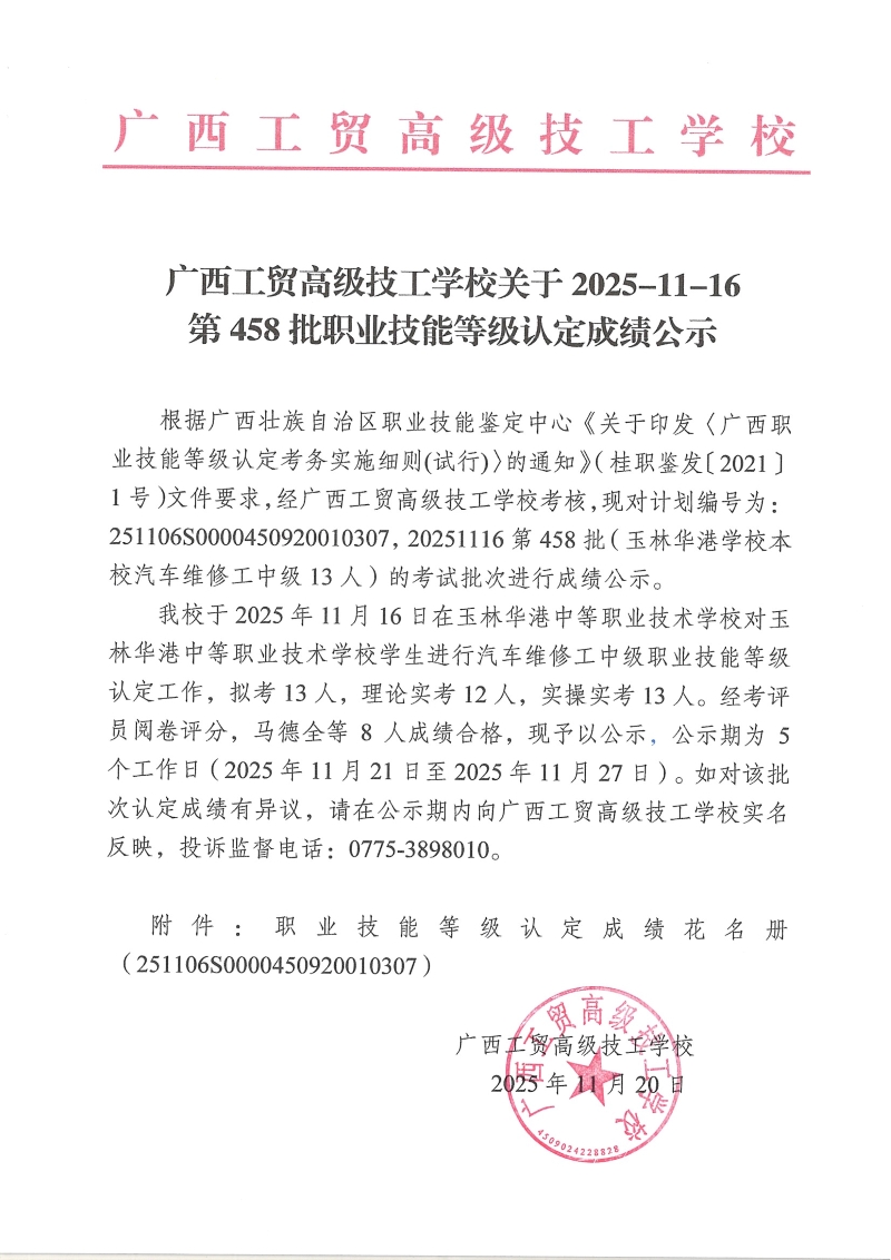 广西工贸高级技工学校关于2025-11-16第458批职业技能等级认定成绩公示