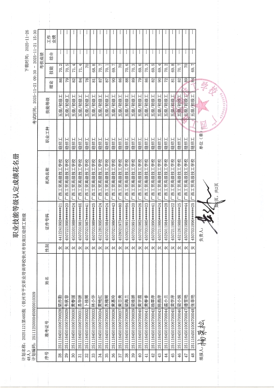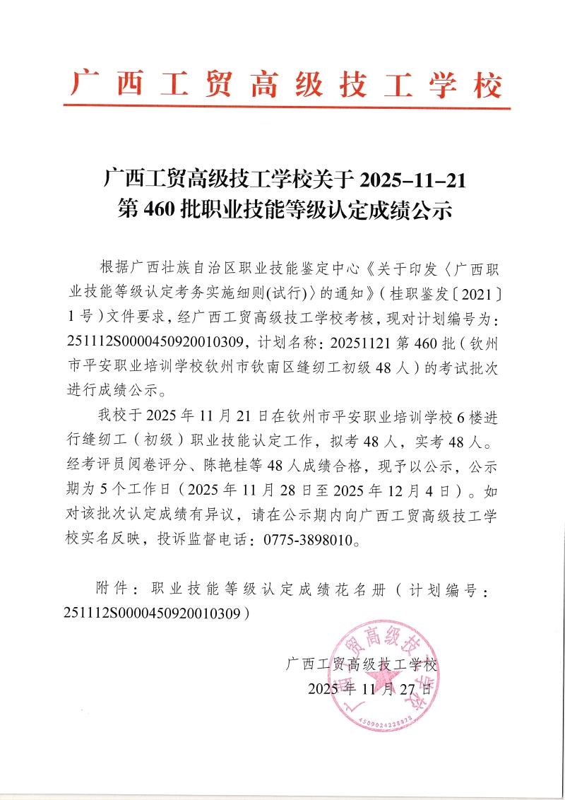 广西工贸高级技工学校关于2025-11-21第460批职业技能等级认定成绩公示