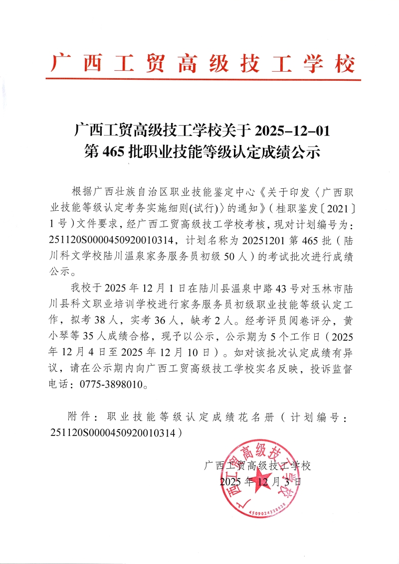 广西工贸高级技工学校关于2025-12-01第465批职业技能等级认定成绩公示