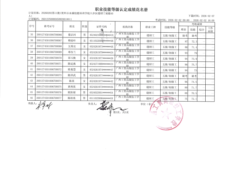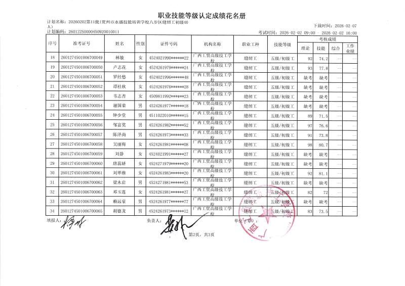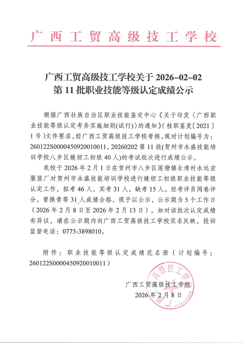 广西工贸高级技工学校关于2026-02-02第11批职业技能等级认定成绩公示