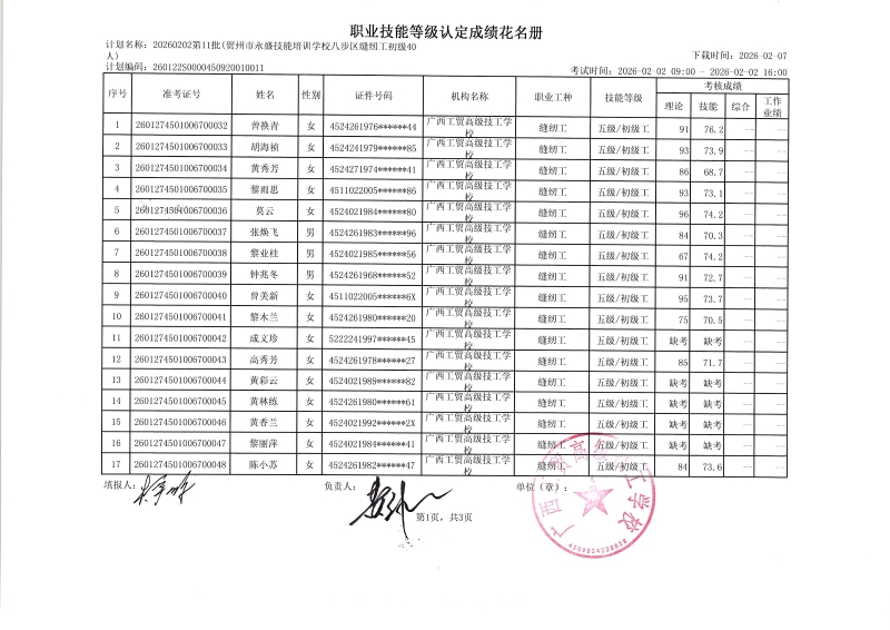 广西工贸高级技工学校关于2026-2-8第16批职业技能等级认定成绩公示