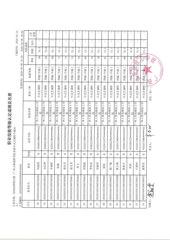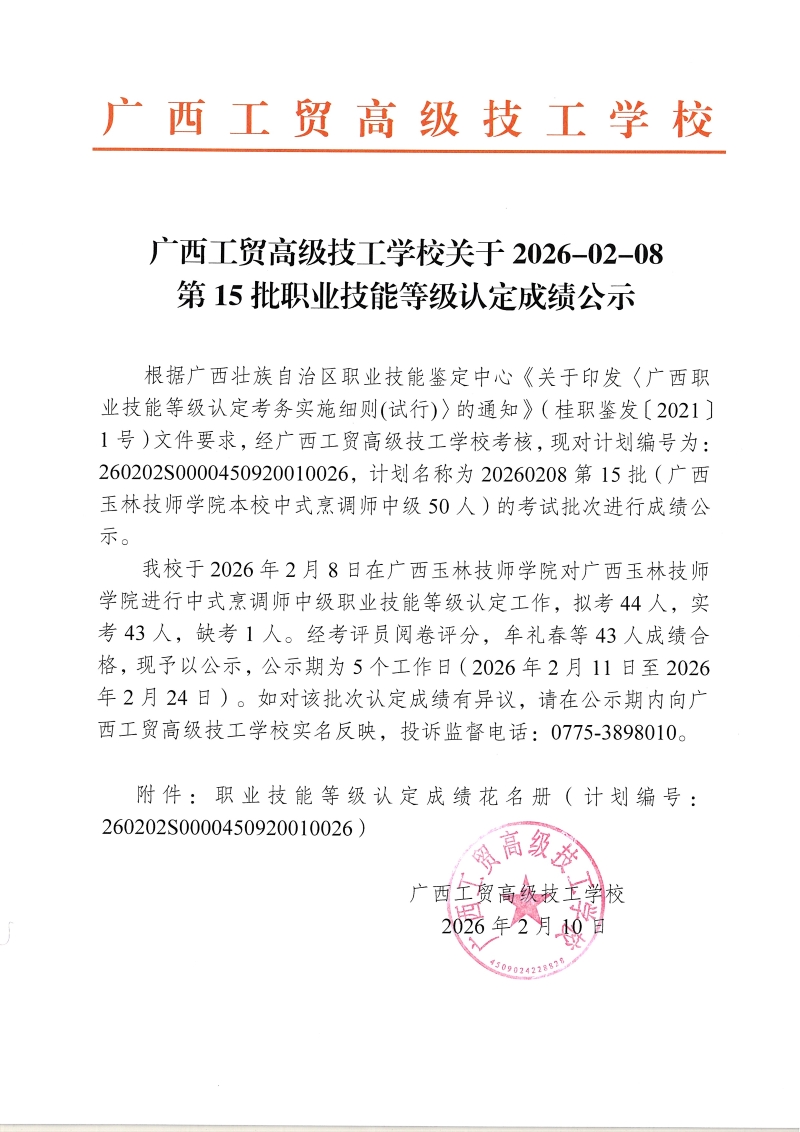 广西工贸高级技工学校关于2026-02-08第15批职业技能等级认定成绩公示