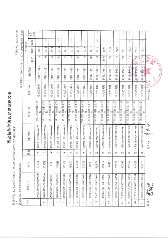 广西工贸高级技工学校关于2026-2-8第16批职业技能等级认定成绩公示