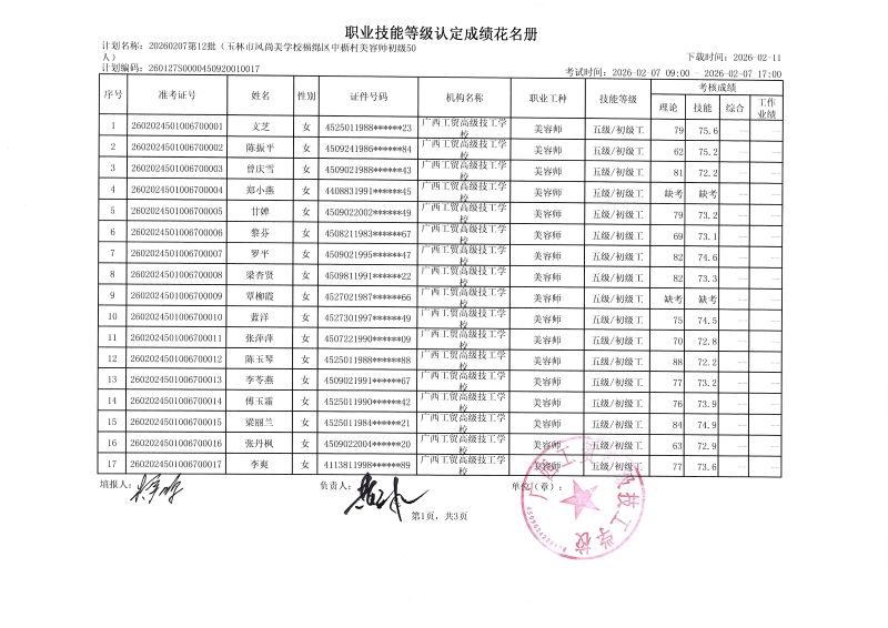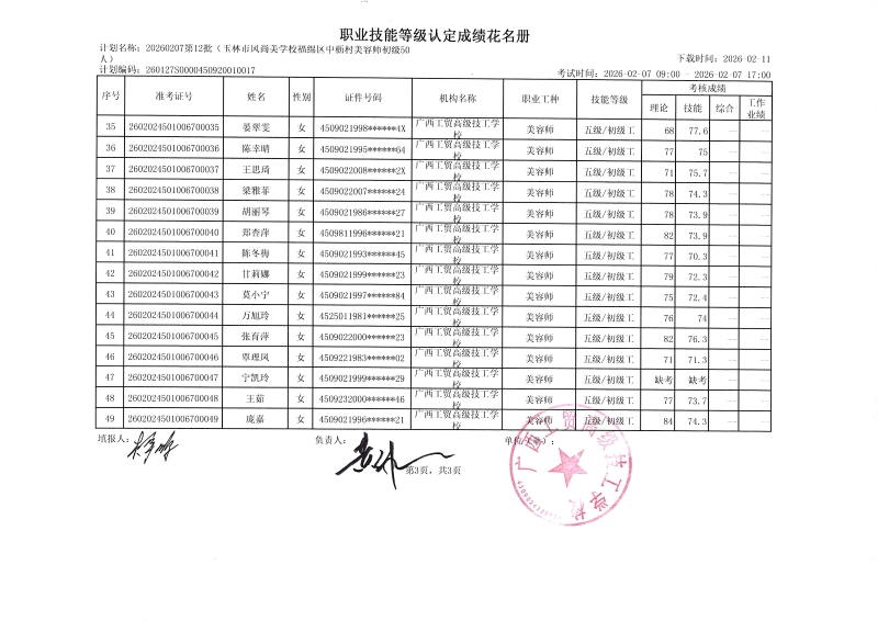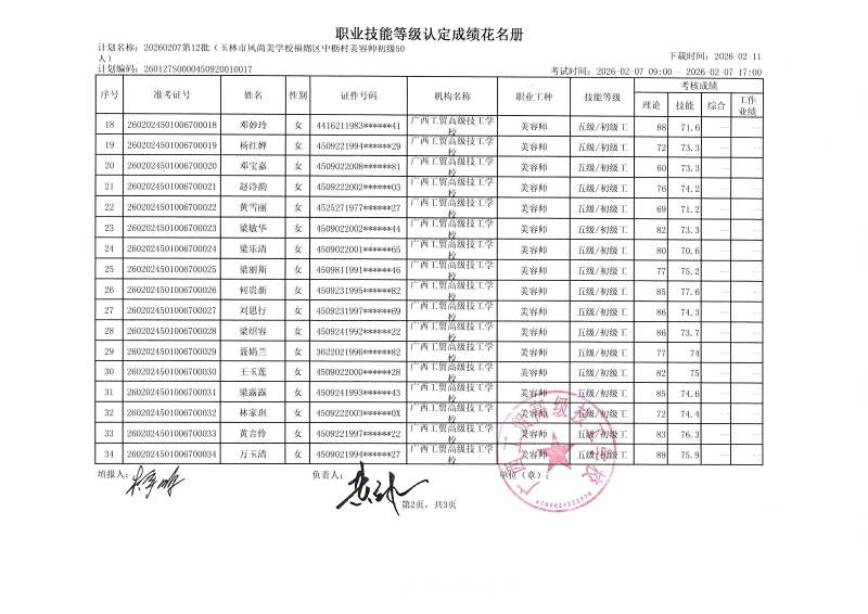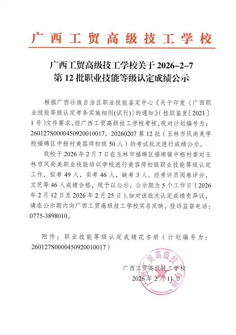 广西工贸高级技工学校关于2026-2-7第12批职业技能等级认定成绩公示